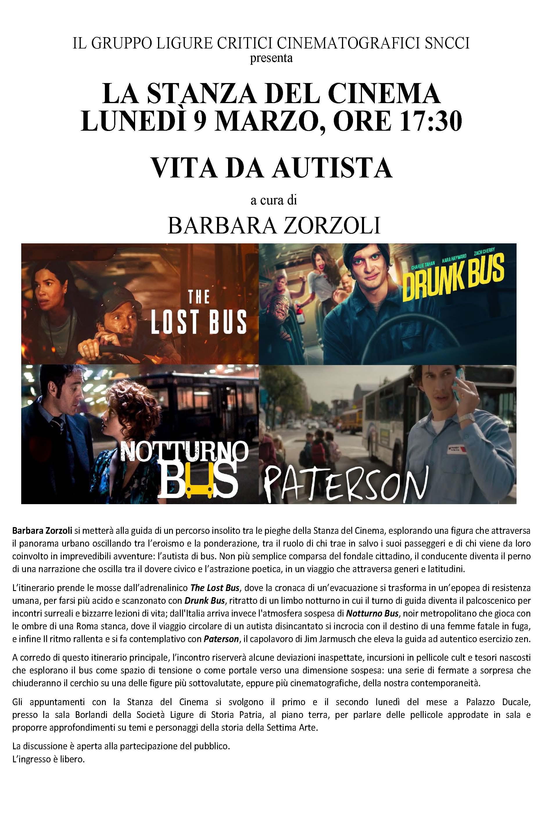 Barbara Zorzoli si metterà alla guida di un percorso insolito tra le pieghe della Stanza del Cinema, esplorando una figura che attraversa il panorama urbano oscillando tra l’eroismo e la ponderazione, tra il ruolo di chi trae in salvo i suoi passeggeri e di chi viene da loro coinvolto in imprevedibili avventure: l’autista di bus. Non più semplice comparsa del fondale cittadino, il conducente diventa il perno di una narrazione che oscilla tra il dovere civico e l’astrazione poetica, in un viaggio che attraversa generi e latitudini.