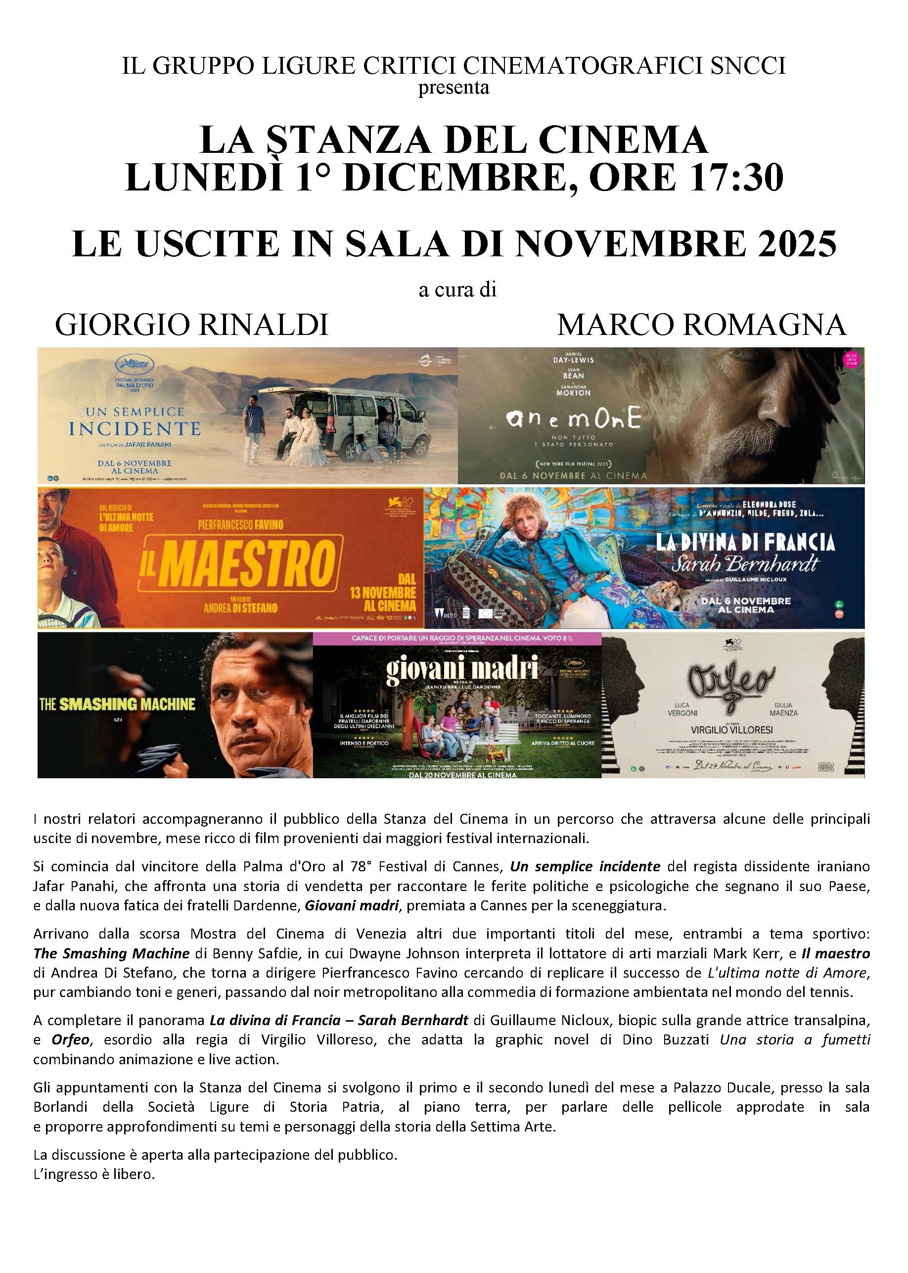Gli appuntamenti con la Stanza del Cinema si svolgono il primo e il secondo lunedì del mese a Palazzo Ducale, presso la sala Borlandi della Società Ligure di Storia Patria, al piano terra, per parlare delle pellicole approdate in sala e proporre approfondimenti su temi e personaggi della storia della Settima Arte.