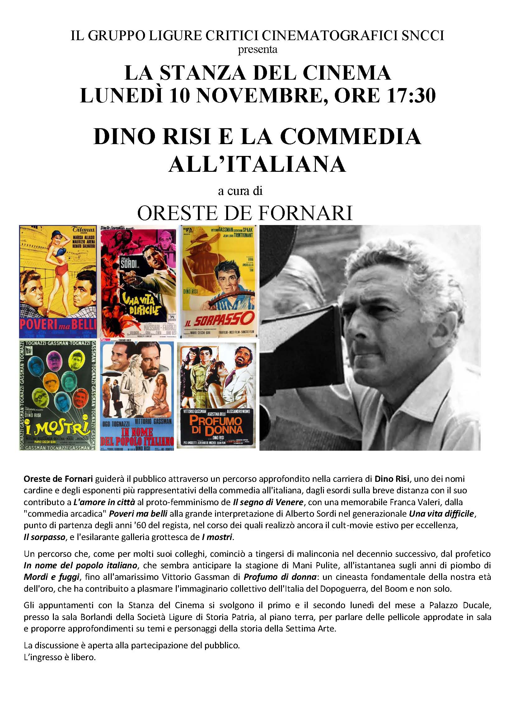 Oreste de Fornari guiderà il pubblico attraverso un percorso approfondito nella carriera di Dino Risi, uno dei nomi cardine e degli esponenti più rappresentativi della commedia all'italiana, dagli esordi sulla breve distanza con il suo contributo a L'amore in città al proto-femminismo de Il segno di Venere, con una memorabile Franca Valeri, dalla "commedia arcadica" Poveri ma belli alla grande interpretazione di Alberto Sordi nel generazionale Una vita difficile, punto di partenza degli anni '60 del regista, nel corso dei quali realizzò ancora il cult-movie estivo per eccellenza, Il sorpasso, e l'esilarante galleria grottesca de I mostri.