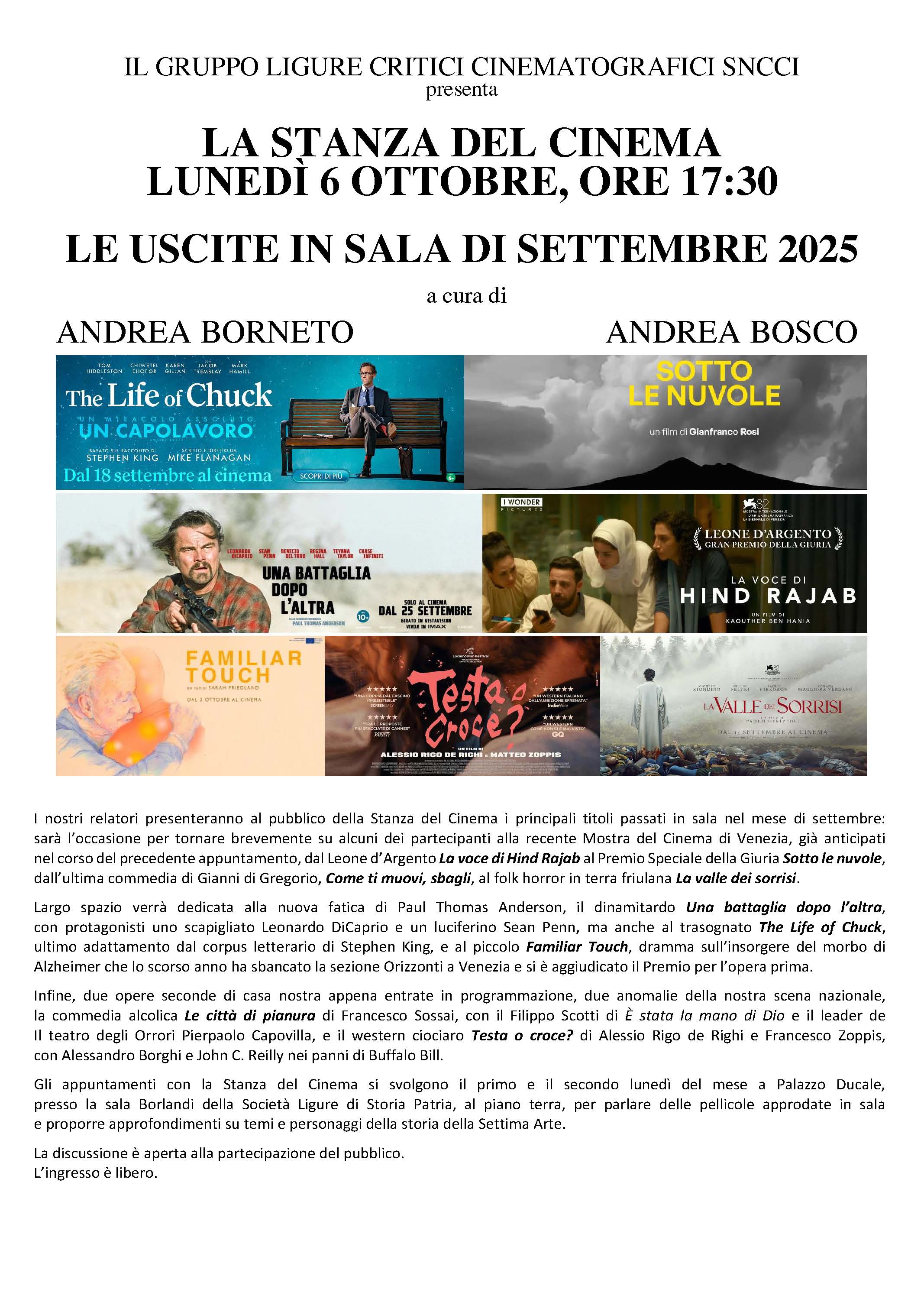 I nostri relatori presenteranno al pubblico della Stanza del Cinema i principali titoli passati in sala nel mese di settembre: sarà l’occasione per tornare brevemente su alcuni dei partecipanti alla recente Mostra del Cinema di Venezia, già anticipati nel corso del precedente appuntamento, dal Leone d’Argento La voce di Hind Rajab al Premio Speciale della Giuria Sotto le nuvole, dall’ultima commedia di Gianni di Gregorio, Come ti muovi, sbagli, al folk horror in terra friulana La valle dei sorrisi.